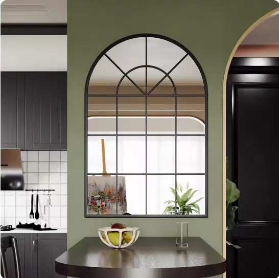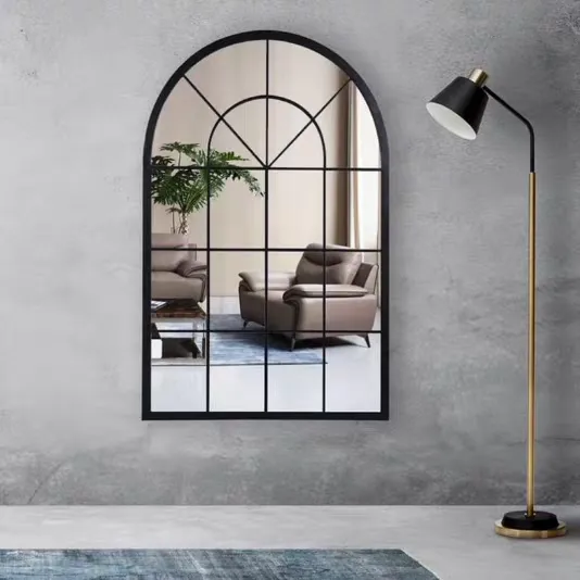 This arched vanity mirror features surrounding bulb LEDs, casting soft, even light perfect for makeup. Its sleek black frame adds modern charm, while the freestanding design fits bedrooms or dressing areas—blending function with eye-catching decor.
