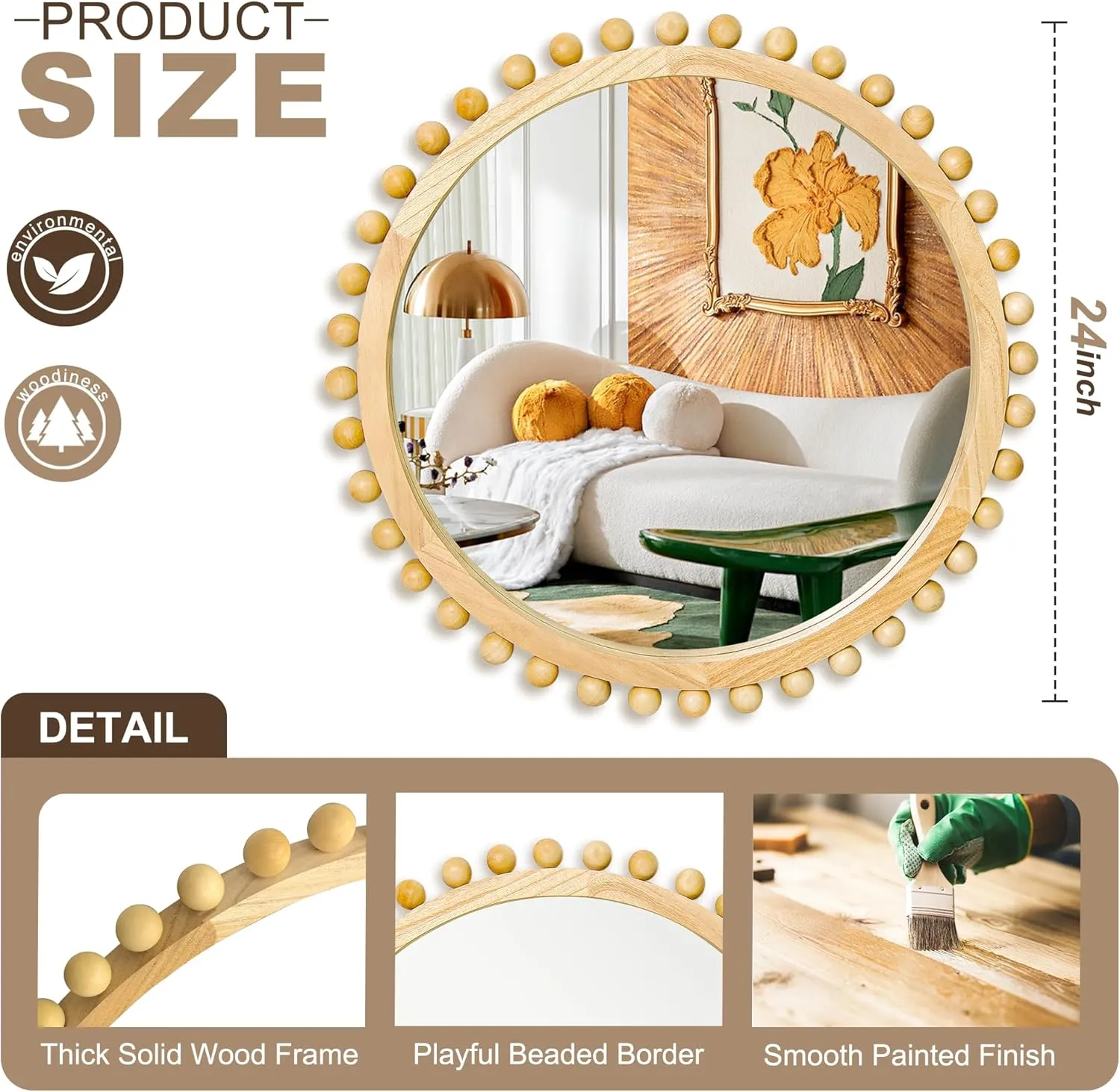 Boho Wooden Beaded Round Wall Mirror for Home Decor
