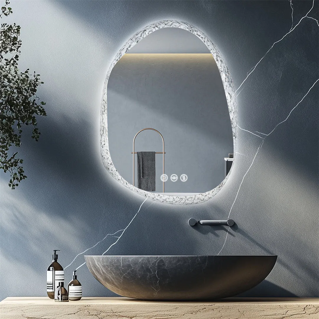 Elevate your bathroom decor with this statement-making LED vanity mirror. The organic, asymmetrical silhouette and shimmering gold-veined frame create a glamorous focal point, while the soft, energy-efficient backlighting casts a warm, even glow to enhance your daily routine. Built with anti-fog technology, it ensures a clear reflection even in steamy environments. The high-definition mirror glass delivers distortion-free clarity, and the durable construction guarantees long-lasting use. Perfect for contemporary bathrooms, hotel suites, or luxury powder rooms, this mirror effortlessly blends artful design with practical features, making it a must-have upgrade for anyone seeking both style and performance.