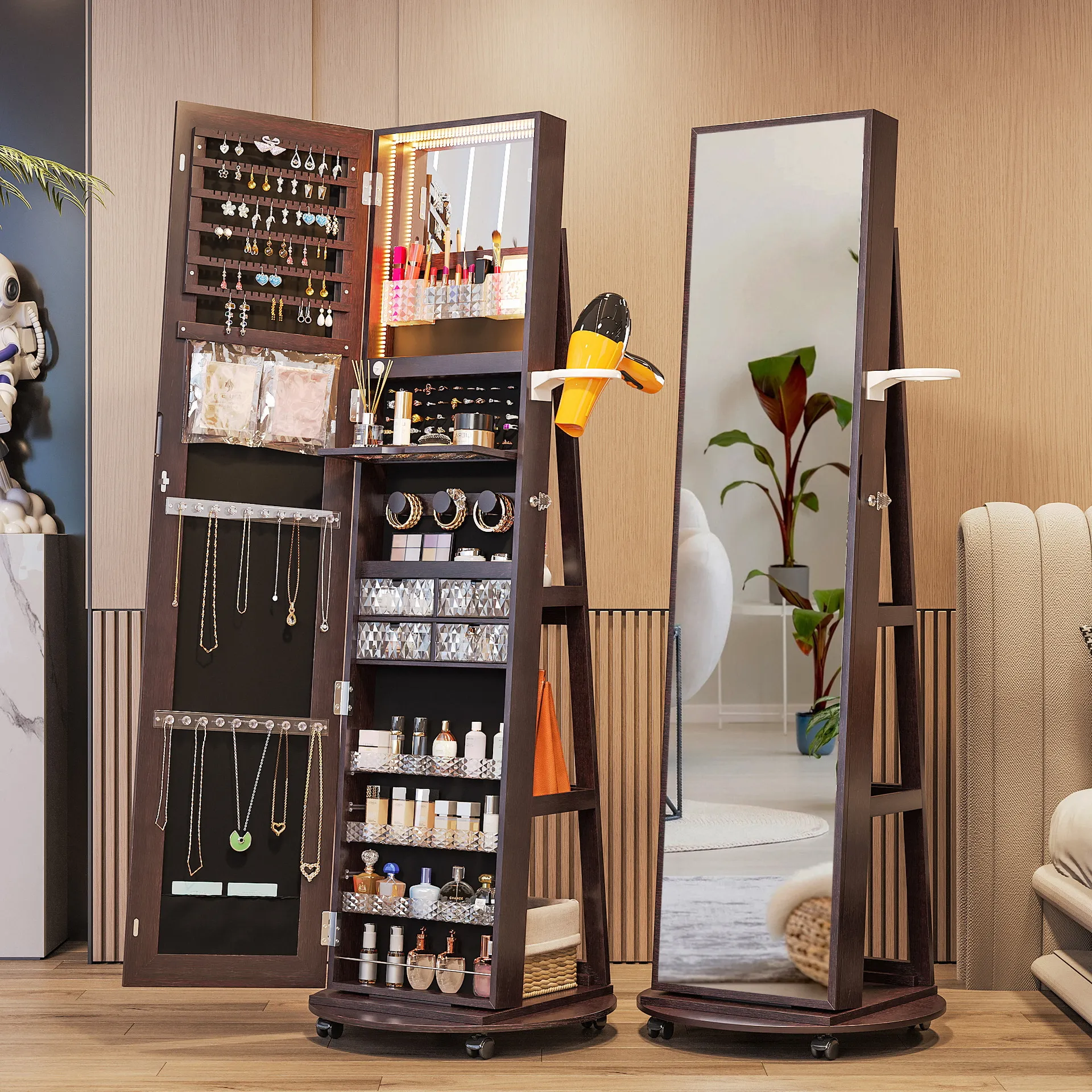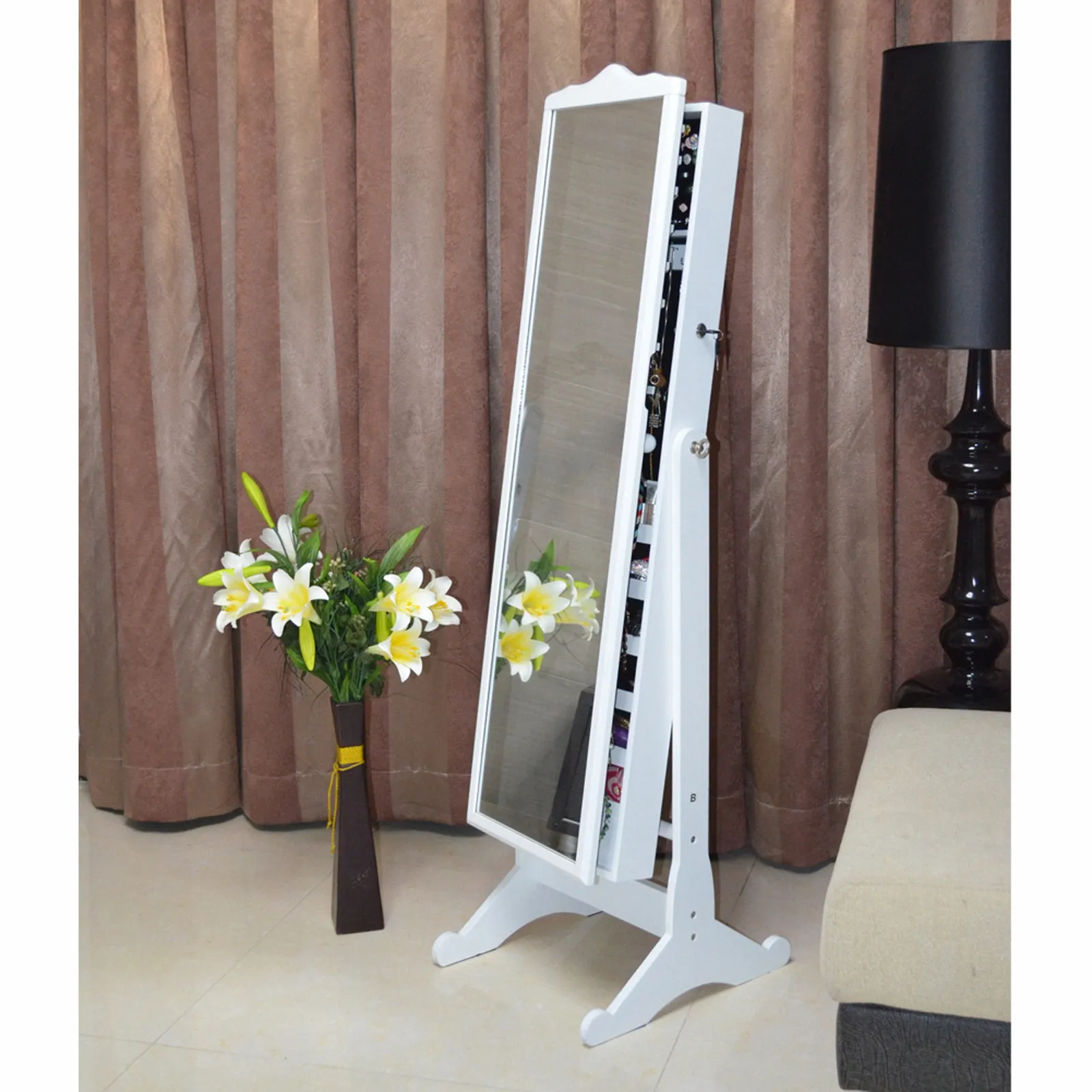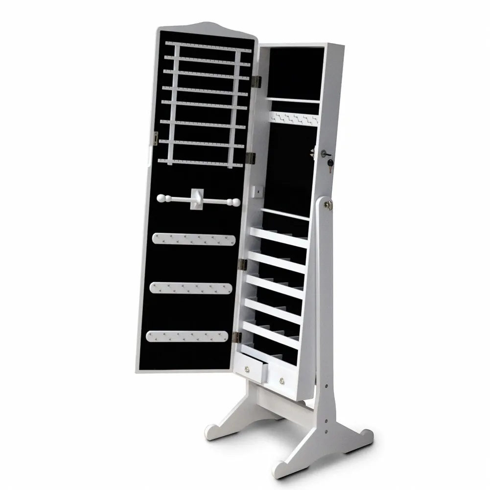 Crafted from high-quality MDF wood with a sleek white finish, this armoire features a full-length mirror that opens to reveal a meticulously organized interior. Inside, you’ll find dedicated sections for earrings, necklaces, bracelets, and rings, plus shelves and compartments for cosmetics, skincare, and accessories. Some models even include built-in LED lighting for clear visibility and a side holder for hair tools. The stable, often wheeled base ensures easy mobility, while the lockable design keeps your valuables secure. Whether you’re styling an outfit, applying makeup, or organizing your jewelry collection, this MDF wooden jewelry mirror armoire combines functionality and elegance, turning clutter into a curated, luxurious experience.